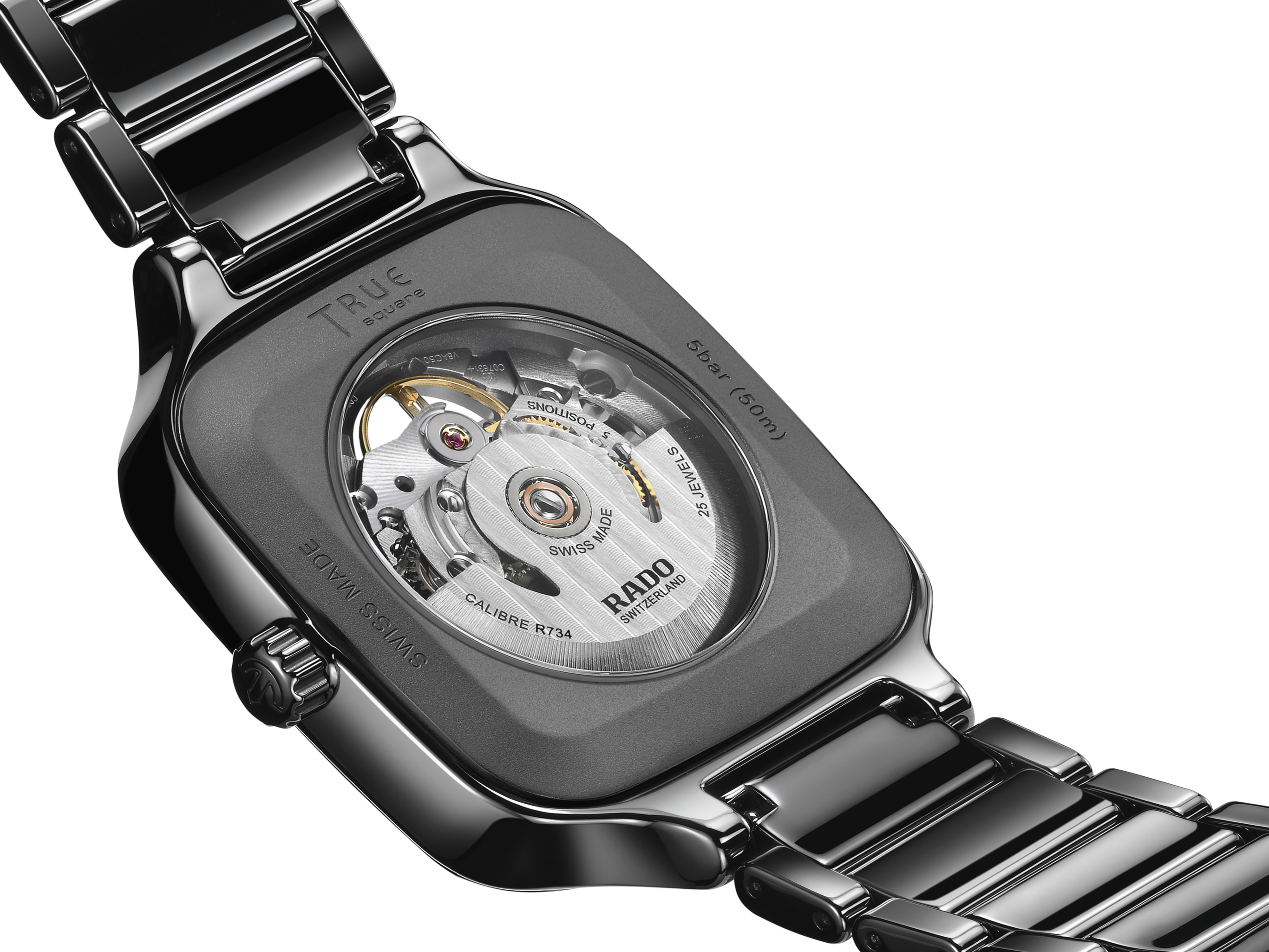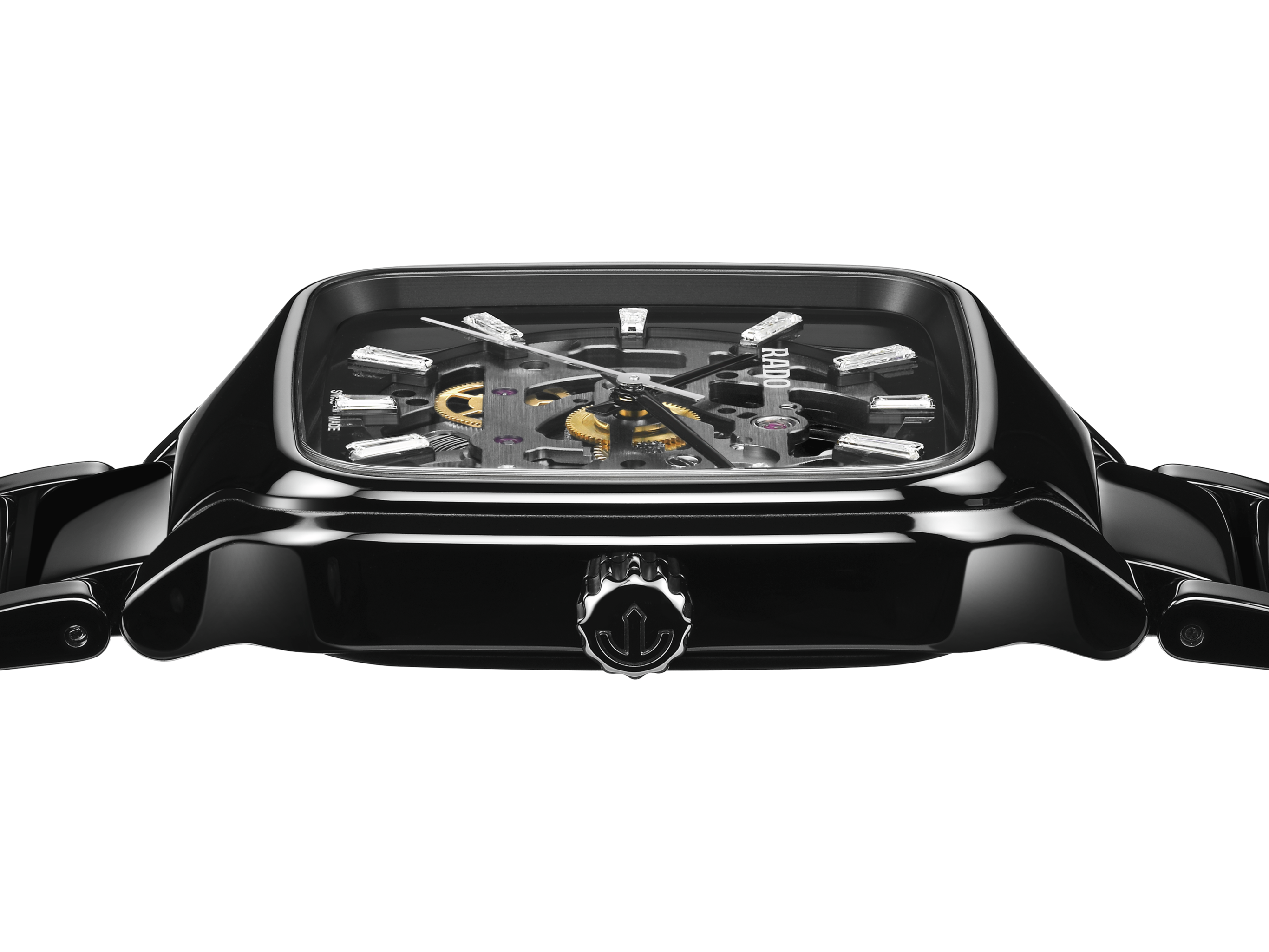 The Rado True Square Skeleton blends high-tech materials and fine craftsmanship. Housed in a 38 mm black, monobloc, high-tech ceramic case, the R808 skeleton movement features 25 jewels and offers an 80-hour power reserve, an antimagnetic Nivachron™ hairspring, with testing exceeding standard requirements being tested and adjusted in five positions. The skeletonisation gives a unique and personal look into the heart of the watch, bringing the wearer even closer to the timepiece. The monobloc case (38 x 44.2 x 97) is complemented by a flat sapphire crystal with antireflective coating. The polished black, high-tech ceramic bracelet flows seamlessly into a titanium 3-fold clasp. Finally, the trapezoidal Top Wesselton, VS-SI, diamonds used as indexes give this model an exclusive sparkle and elegant look.
