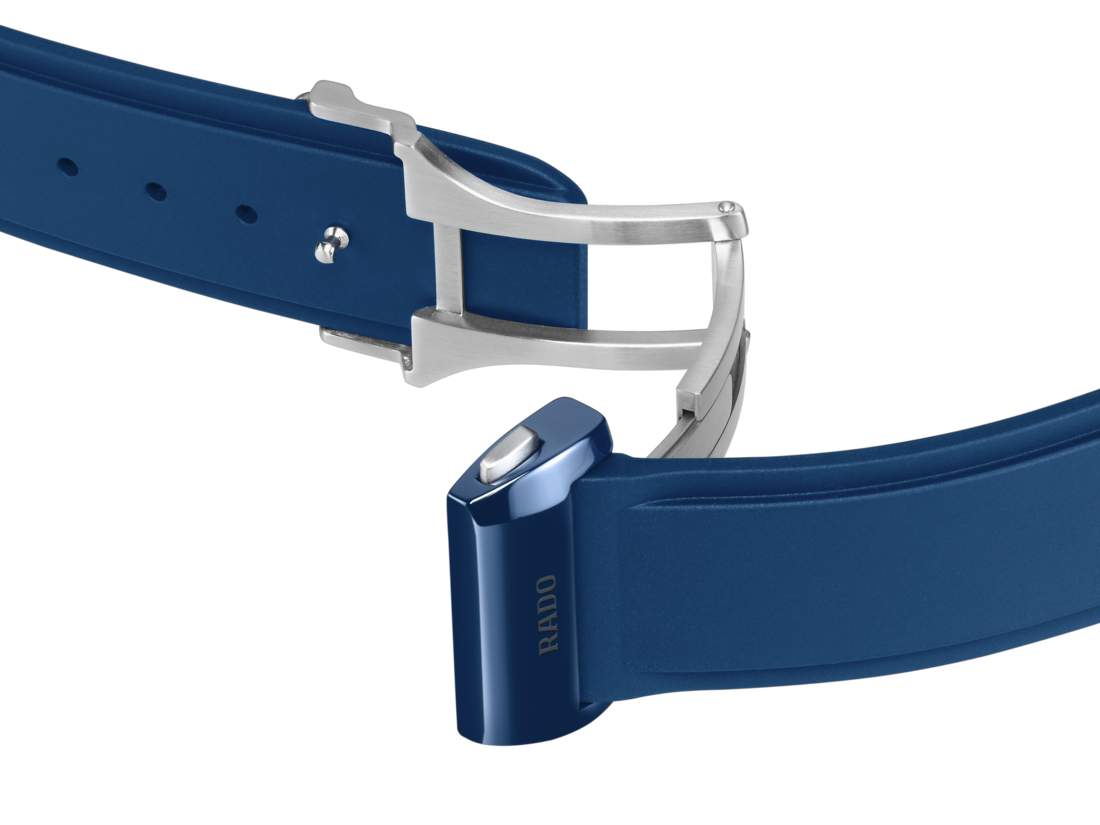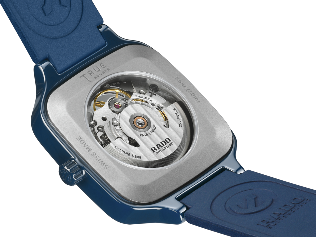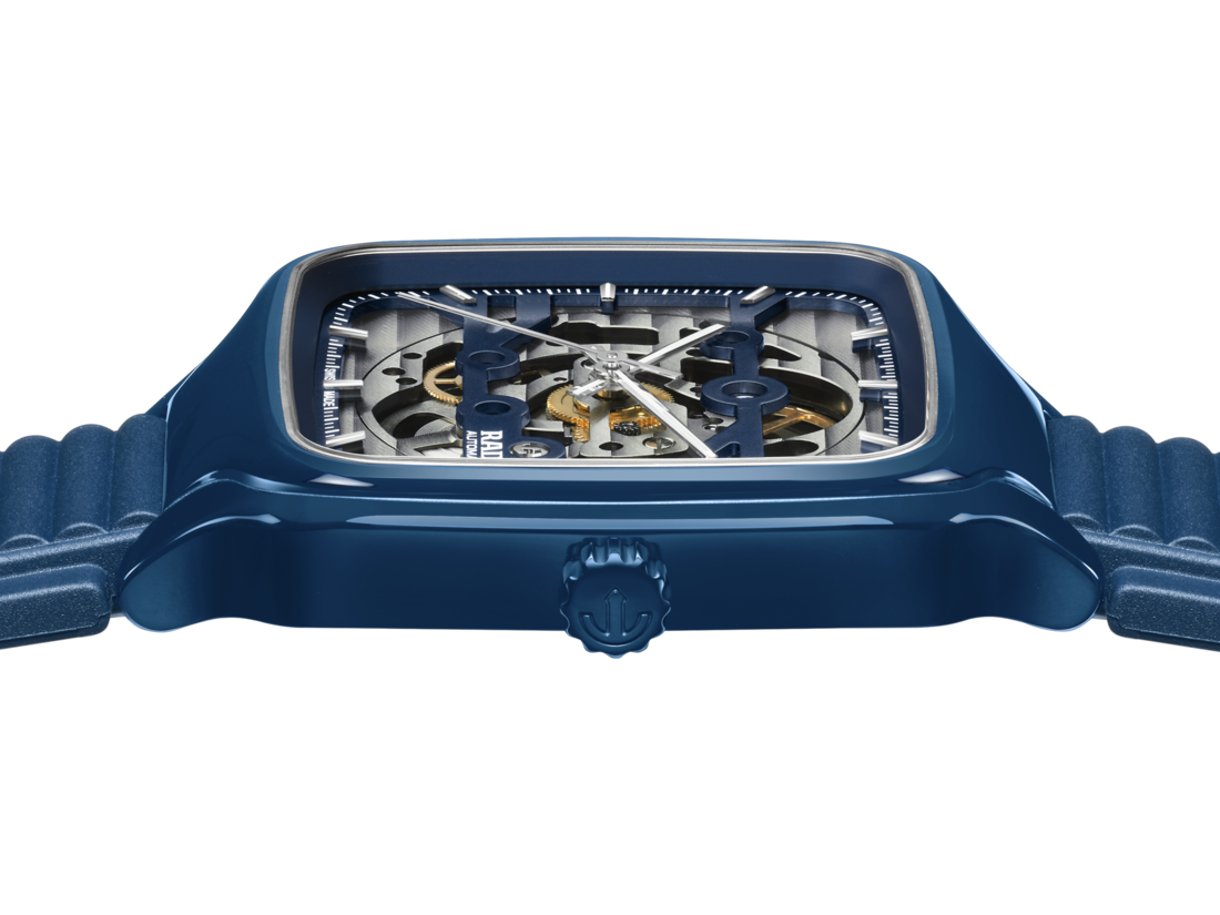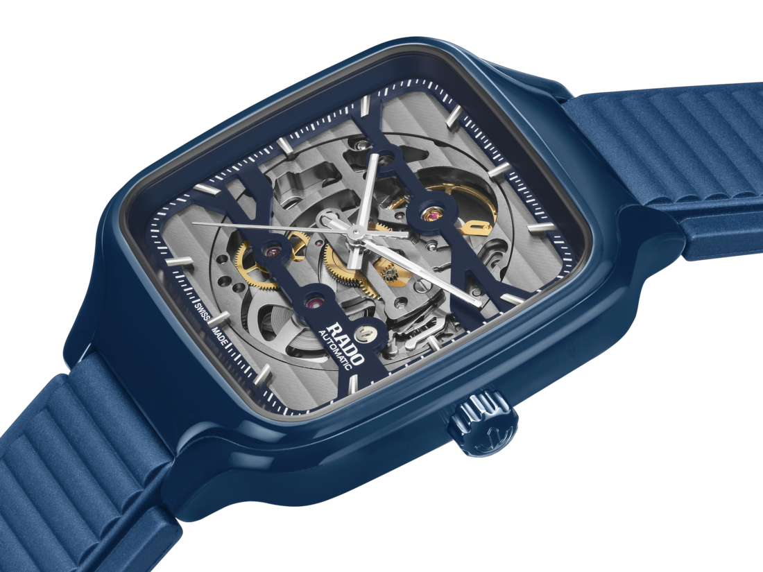 The True Square Skeleton is one of Rado’s best-known models. Its big and bold case with softly rounded corners has pleased watch wearers from the start and the addition of a skeleton see-through movement with contrasting elements and meticulous finishing, refined the product line to a new level of sophistication. The latest model, in deep blue, comes for the first time with a blue rubber strap that matches the case, and a newly designed clasp using a high-tech ceramic cover, also in blue. Inside, protected by a flat sapphire crystal with anti-reflective treatment on both faces, a superb R808 calibre with a Nivachron™ hairspring, chosen for its resistance to shocks, temperature fluctuations and magnetic fields, ensures absolute precision.
