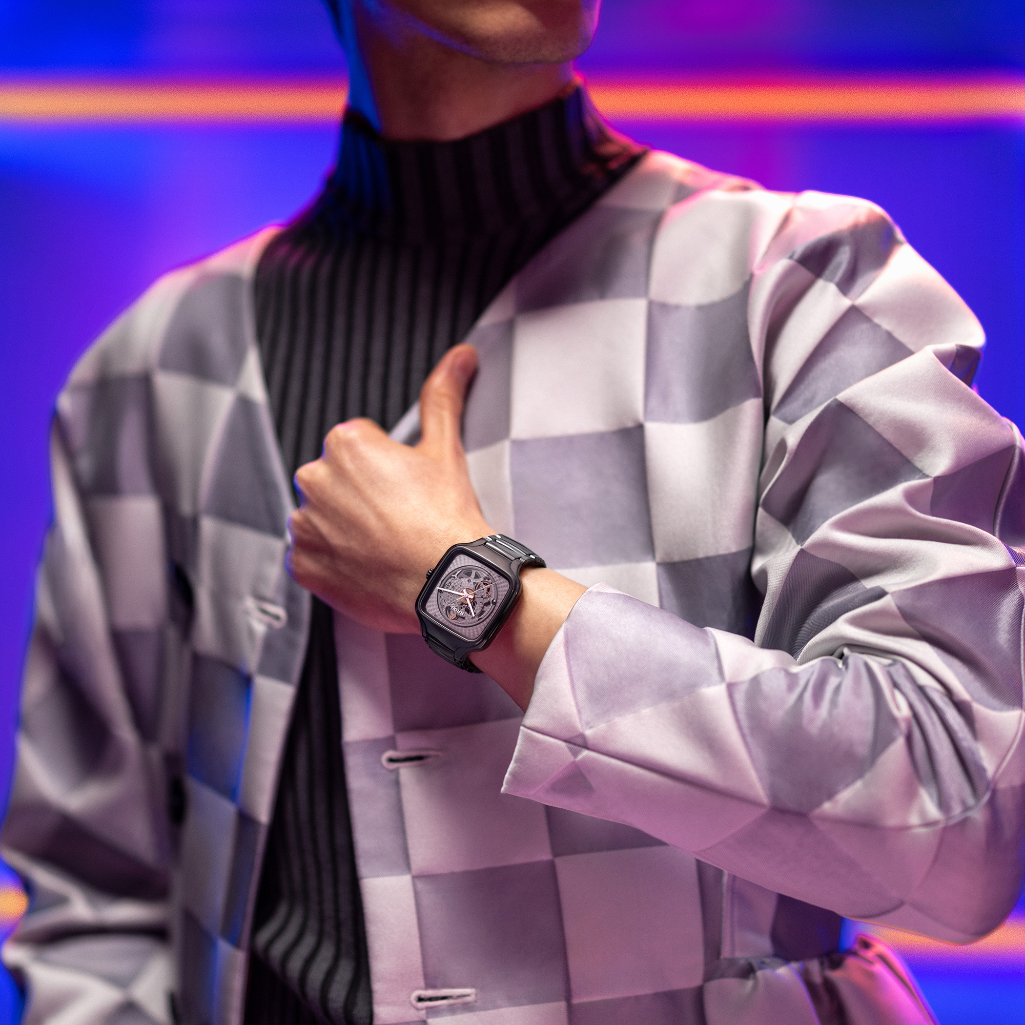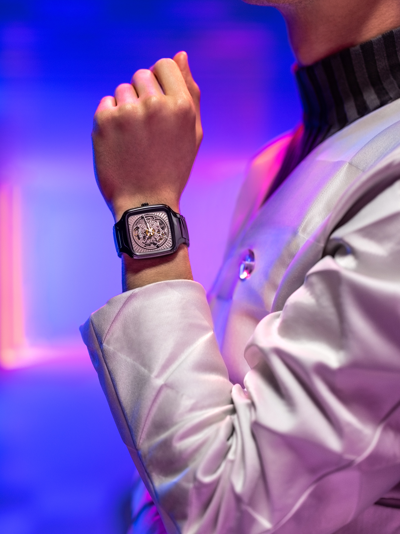 Experience the perfect fusion of artistry and precision with the Rado True Square x Kunihiko Morinaga created together with the visionary Japanese fashion designer Kunihiko Morinaga. This remarkable timepiece features an admirable automatic Rado calibre R734, with 80-hour power reserve and antimagnetic Nivachron™ balance spring. Like the movement holder, it features circular grain decoration. With a 38 mm case size, the polished black high-tech ceramic case and crown exude a sleek and contemporary allure. The flat sapphire crystal, with anti-reflective coating on both sides, offers exceptional clarity. The transparent dial with photochromic effect makes the movement visible or invisible. When it is exposed to sunlight (UV rays), the True Square’s dial darkens. But as the sun goes down the dial shade evolves into grey and finally becomes transparent. The silver hands, enhanced with white veneer and white Super-LumiNova®, ensure excellent visibility, while adding a subtle touch of elegance. Completing the ensemble is the polished black high-tech ceramic bracelet, offering both comfort and durability.