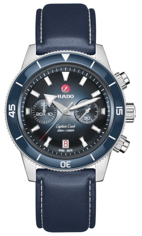 Captain Cook Chronograph'ın her iki tarafında yansıma önleyici kaplamalı, çizilmeye dayanıklı safirden üretilmiş karakteristik bir dik kesim cam bulunuyor. İnce, şık 43 mm'lik paslanmaz çelik kasanın bezelinde, gümüşten maviye renk geçişli kadranı tamamlayan parlak mavi ileri teknoloji seramik bir eklenti vardır. Sayılar, göstergeler ve üçgenler Super-LumiNova® ile kaplanmıştır. İçerisinde; 37 taşlı, beş ibreli ve anti-manyetik NivachronTMbalans yayı sayesinde 59 saatlik güç rezervi sunan, standart gereksinimleri 3 yerine 5 konumda karşılayarak daha yüksek hassasiyet sunan yeni, daha ince R801 otomatik mekanizma bulunuyor. Bu modelde, parlak ve zımparalanmış bir paslanmaz çelik bilezik ve de yedek olarak bir mavi deri kayış ve koyu mavi bir kumaş kayış olmak üzere toplam üç seçenek bulunmaktadır.