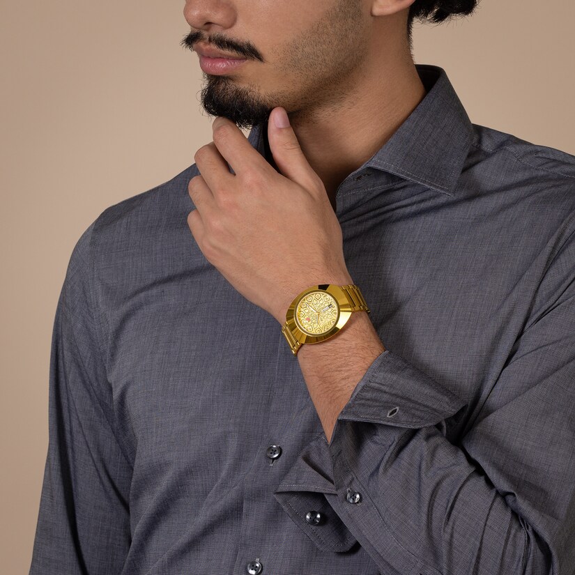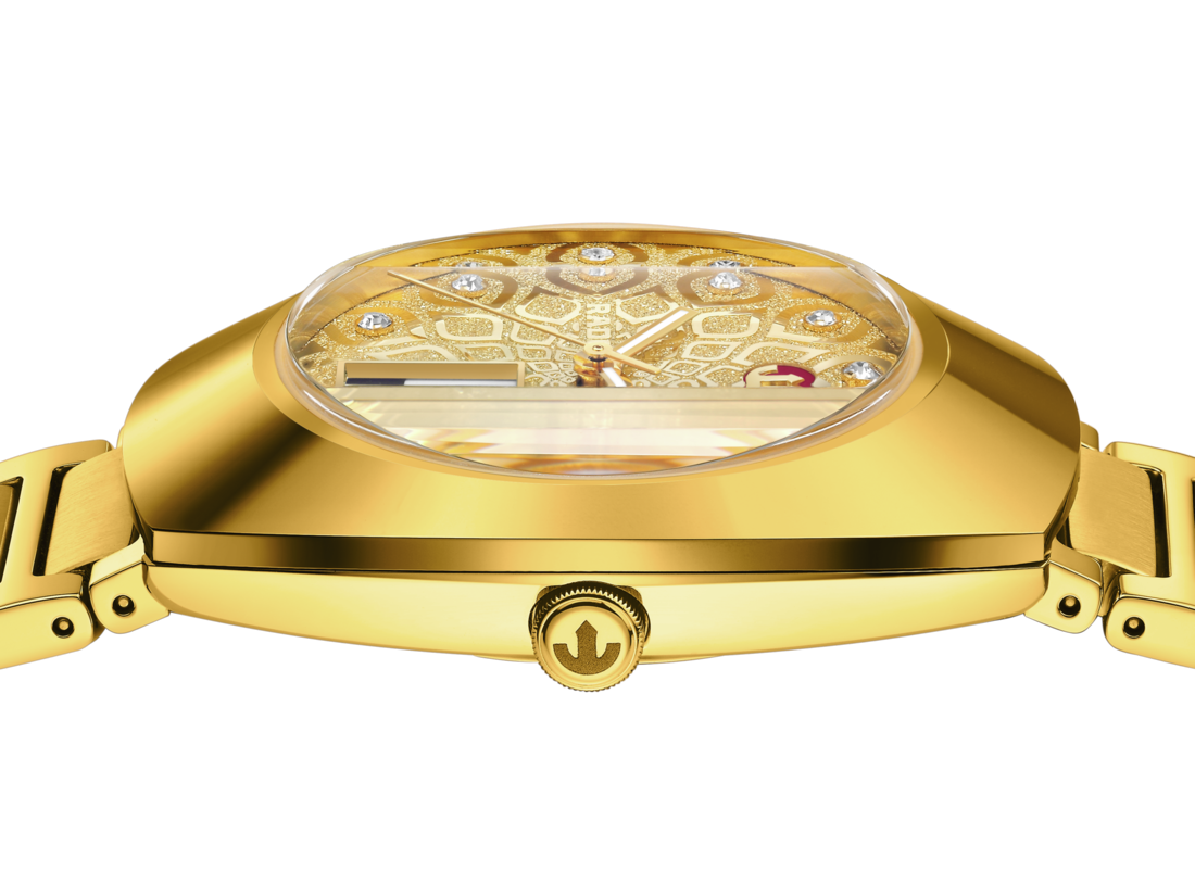 Eşsiz DiaStar Original’in çapı 38 mm'dir ve 100 m'ye kadar su geçirmezdir. Parlak kenarlara ve detaylara sahip ultra ışıltılı sarı altın renkli Ceramos™ kapağı uyumlu ve sarı altın renkli PVD kaplama paslanmaz çelik kasa üstüne yerleştirilmiş bu güzel saat, dikey yönlü safir cam ile tamamlanmıştır. Özellikleri arasında beyaz Super-LumiNova® kaplamalı sarı renkli ibreler, beyaz bir gün göstergesi ve siyah bir tarih göstergesi bulunmaktadır. Kadran, elmas tozu süslemesi üzerine sarı renkli uyumlu bir desen üzerinde on bir adet açık renk kübik zirkona sahiptir. Antimanyetik Nivachron™ balans yayı ile birlikte Rado R764 otomatik mekanizma, 80 saatlik güç rezervi sunmaktadır. Bilezik, sarı altın renkli PVD kaplama parlak ve fırçalanmış paslanmaz çelikten üretilmiştir.