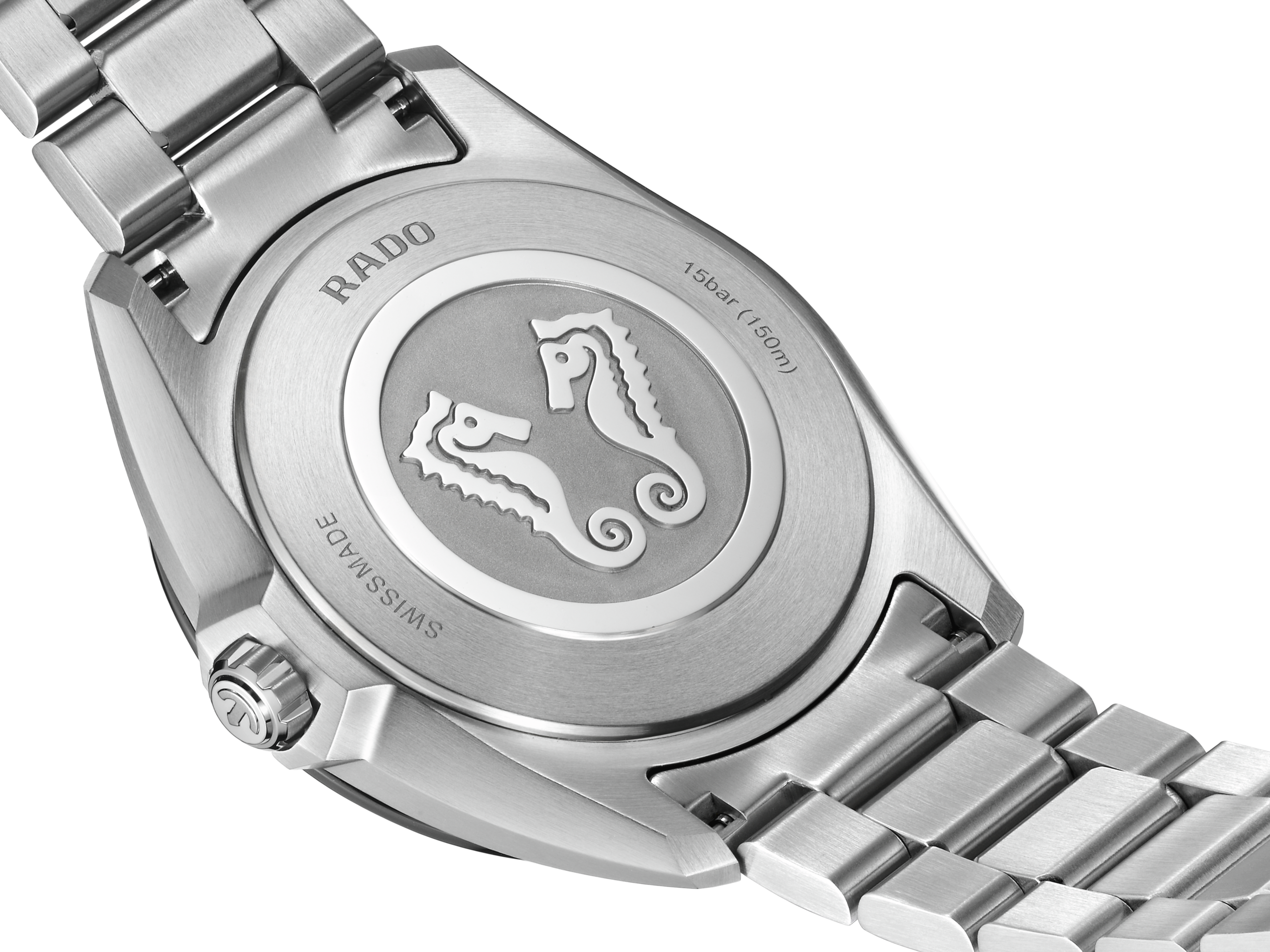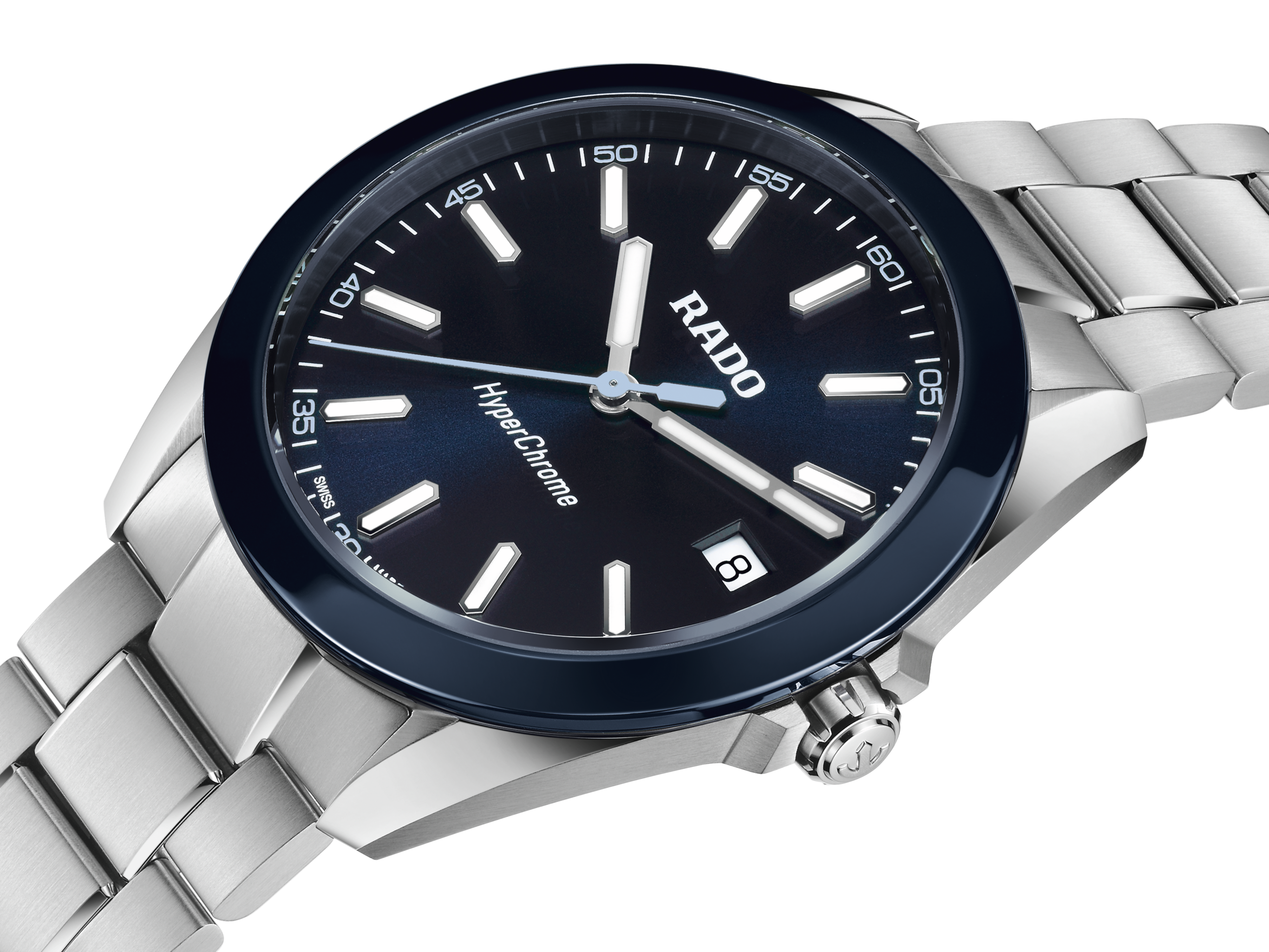 HyperChrome Quartz, gelişmiş saat üretim teknolojisini cesur ve kalıcı bir tasarımla birleştiren, hassasiyet ve malzeme ustalığının çağdaş bir ifadesidir. Parlak ve fırçalanmış paslanmaz çelikten yontulmuş kasa, güç ve zarafetin doğal bir kombinasyonu olan parlak mavi ileri teknoloji seramik bir bezel ile çevrelenmiştir. Bu dayanıklı yapının üstünde, iç tarafında yansıma önleyici kaplamaya sahip kavisli safir cam, çizilmeye karşı olağanüstü dayanıklılık ve kristal netliğinde okunabilirlik sunar. Suya karşı 15 bar’a (150 metre) kadar dayanıklılık sunan mimarisinin her unsuru, her ortamda kalıcı hassasiyet, dayanıklılık ve güven için tasarlanmıştır. Saatin kalbinde yer alan Rado kalibresi R292, olağanüstü doğruluk ve güvenilirlik sağlar. Bu 3 mücevherli kuvars mekanizma PreciDrive ve HeavyDrive teknolojilerini birleştirerek her bir atımın hassas bir şekilde düzenlenmesini ve yılda ± 10 saniyeyi geçmeyen bir sapmanın korunmasını sağlar. Saat 3 yönündeki gizli tarih penceresi, kadranın dengeli S tasarımıyla kusursuz bir şekilde bütünleşmektedir. Koyu mavi güneş ışını kadran, rodyum renkli akrep ve yelkovanın yanı sıra düşük ışıkta optimum okunabilirlik için beyaz Super-LumiNova® ile işlenmiş dizinlerle zarif bir kontrast sunar. Açık mavi saniye ibresi, dakika çizgisindeki rakamların rengini yansıtarak kompozisyona ince ve uyumlu bir ayrıntı katar. Geceleri saat on iki göstergesi ve yelkovan yeşil bir parıltı yayarken, diğer göstergeler ve akrep mavi bir parıltı yayarak her türlü aydınlatma koşulunda saatin hızlı ve kolayca okunmasını sağlar. Kasayı tamamlayan üç sıralı paslanmaz çelik bilezik, fırçalanmış dış bağlantılara ve parlak eğimlerle vurgulanmış orta bağlantılarıyla zarif bir doku etkileşimi yaratır. Üç konumda hızlı ayar sistemine sahip üç katlı bir toka ile sabitlenmiştir ve her zaman hassas ve rahat bir uyum sağlar.