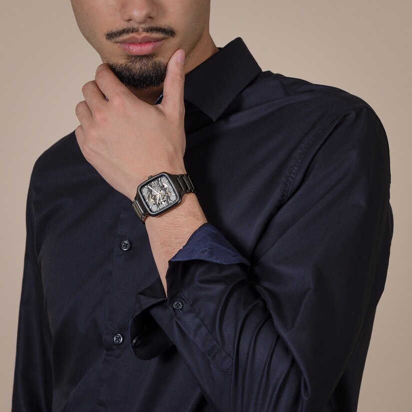 Rado True Square Skeleton, gelişmiş ileri teknoloji materyaller ile ultra ince işçiliği bir araya getiriyor. 38 mm mat siyah ileri teknoloji seramik monoblok kasa içine yerleştirilmiş R808 iskelet mekanizma, 25 değerli taşla donatılmıştır ve 80 saatlik güç rezervi sunar. Beş konumda titizlikle test edilen bu mekanizma, antimanyetik Nivachron™ balans yayı ve kadran tarafındaki yatay fırçalanmış süslemeleriyle İsviçre'nin yüksek hassasiyetli mühendislik mirasının saf bir göstergesidir. Düz safir cam ile taçlandırılan kadran, katmanlı işçiliğin mükemmel bir örneğidir. Siyah kumlanmış iskeletleşmiş üst plaka, alt plakanın üzerinde zarifçe asılı durur. Beyaz SuperLumiNova® indeksler ve özenle yerleştirilmiş beyaz dakika işaretçileri, bu üst katmanda ve koyu arka planda belirgin bir şekilde okunabilirlik sağlar. Alt plaka, hareketle kusursuz bir uyum içinde ince yatay fırçalanmış dekorasyonu sergiler. Saat 4 konumundaki ikonik döner rodyum renkli çapa, bu dinamik ve çok boyutlu ekranı tamamlar. Kasa tasarımını tamamlayan mat siyah ileri teknoloji seramik bilezik, titanyum 3 katlı tokayla kusursuz bir şekilde birleştirilerek ileri teknoloji seramiğin sağladığı olağanüstü kullanım konforunu sunar.