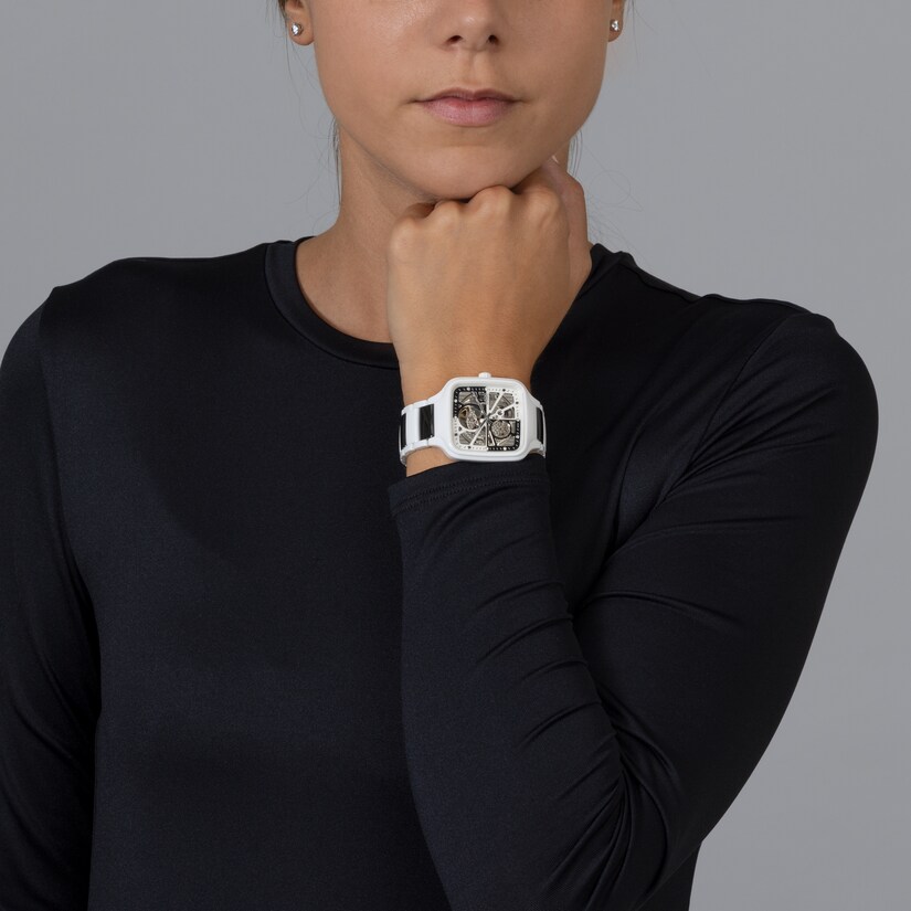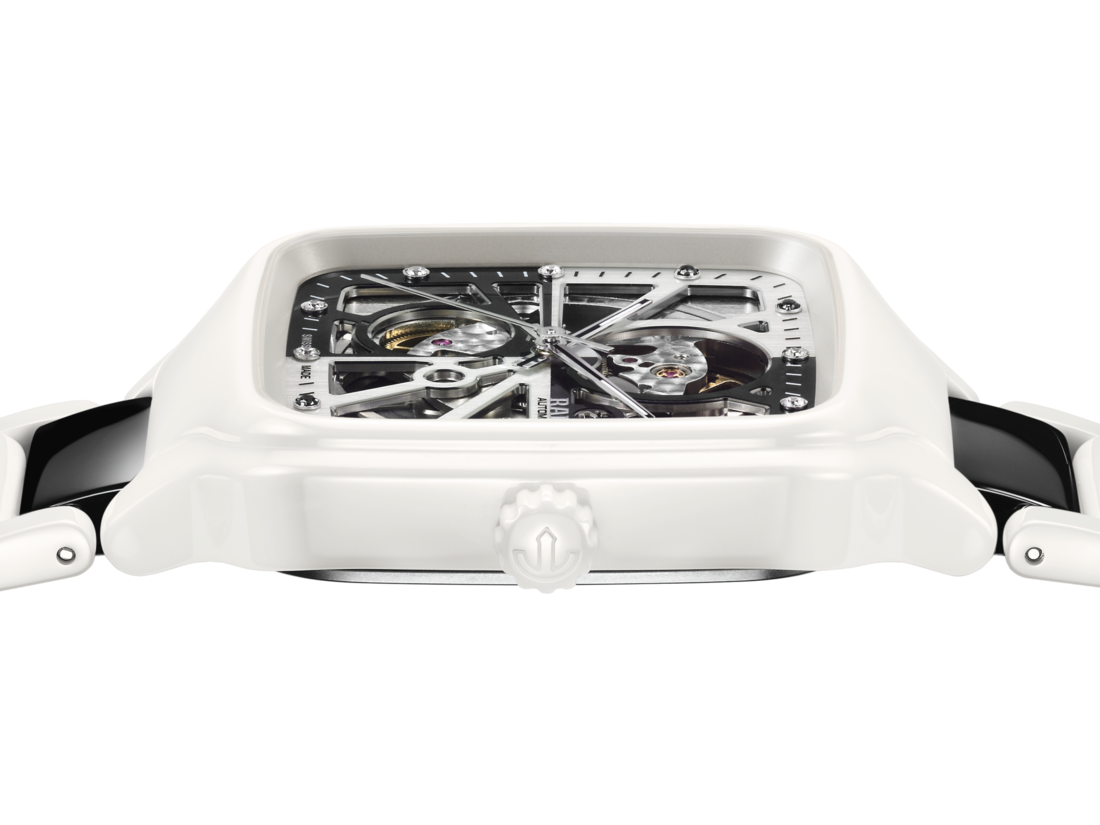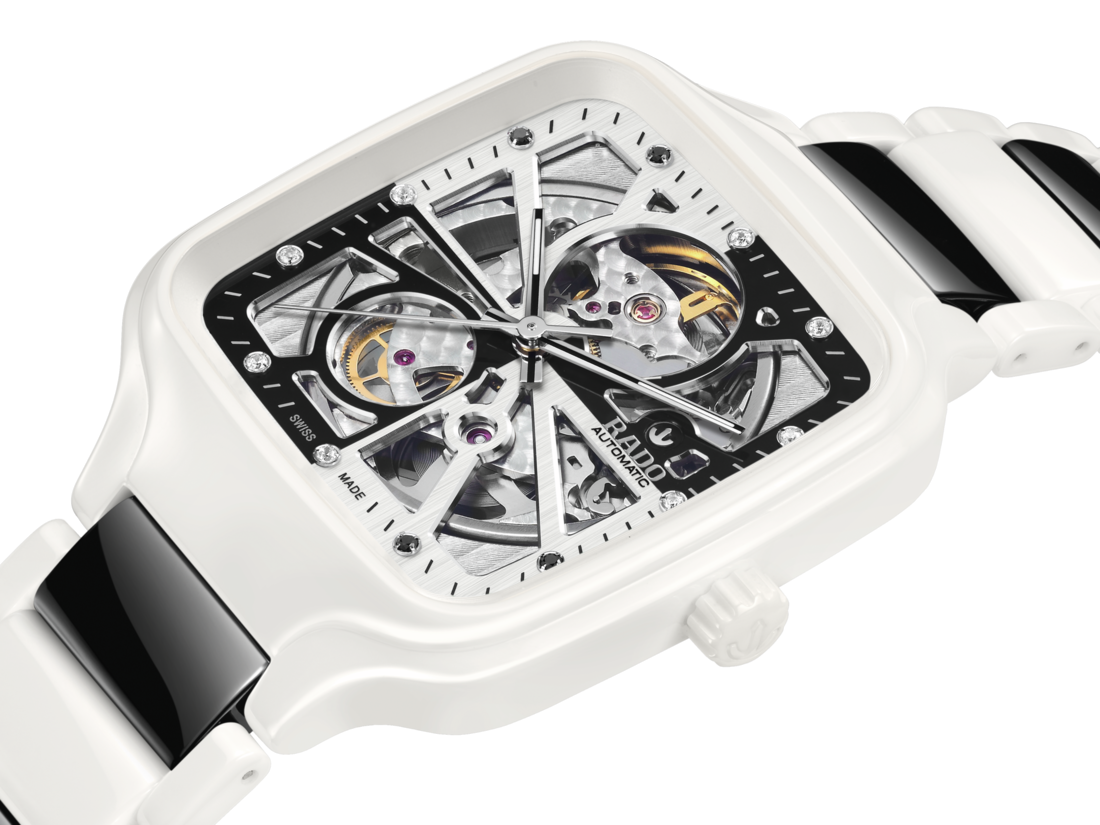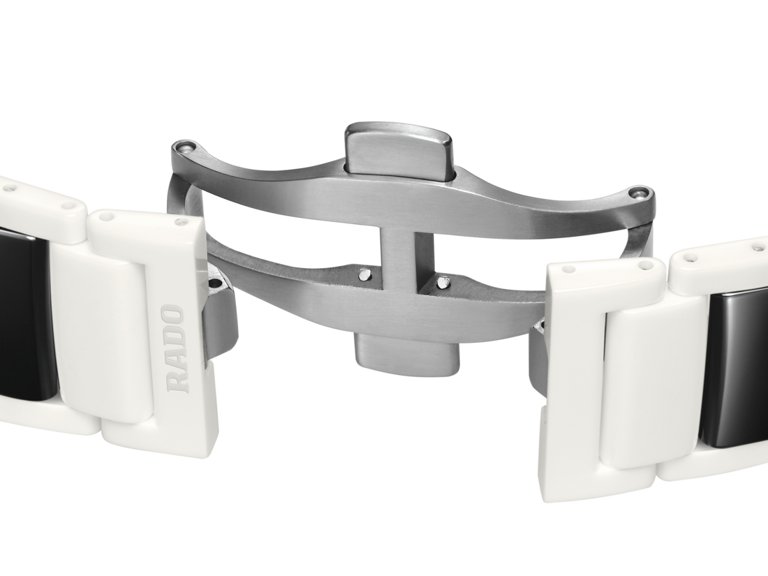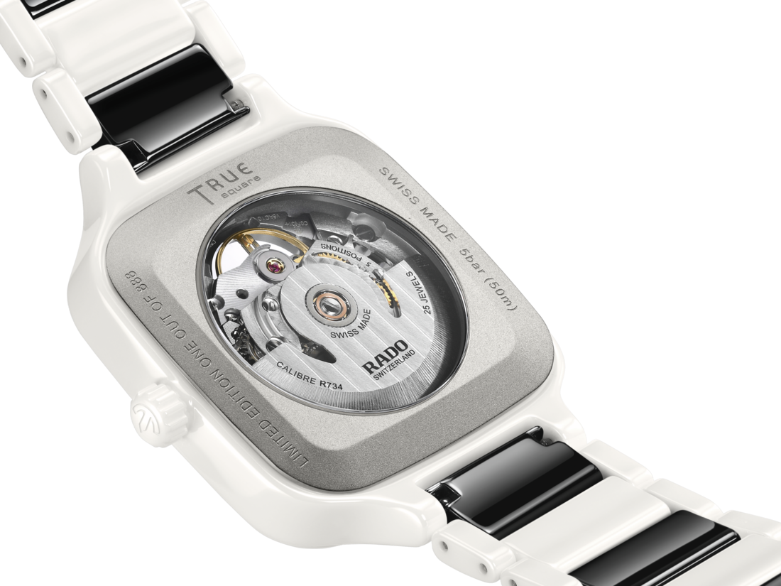This watch has a white high-tech ceramic monobloc case and crown, and its bracelet – also in polished high-tech ceramic – is white and black. The sandblasted titanium case back is fitted with a sapphire crystal and special engraving featuring the words LIMITED EDITION ONE OUT OF 888. Like its black counterpart, it features a black and white vertically brushed dial highlighted by eight white full-cut diamond hour markers and four black ones. It also shares some of the other aesthetic codes that define the stunning dial: the rhodium-coloured bevels, the black flange, and the distinctive rhodium-coloured moving anchor symbol on a contrasting black background. And its identity is confirmed by the silver printed Rado and black printed Automatic logos.