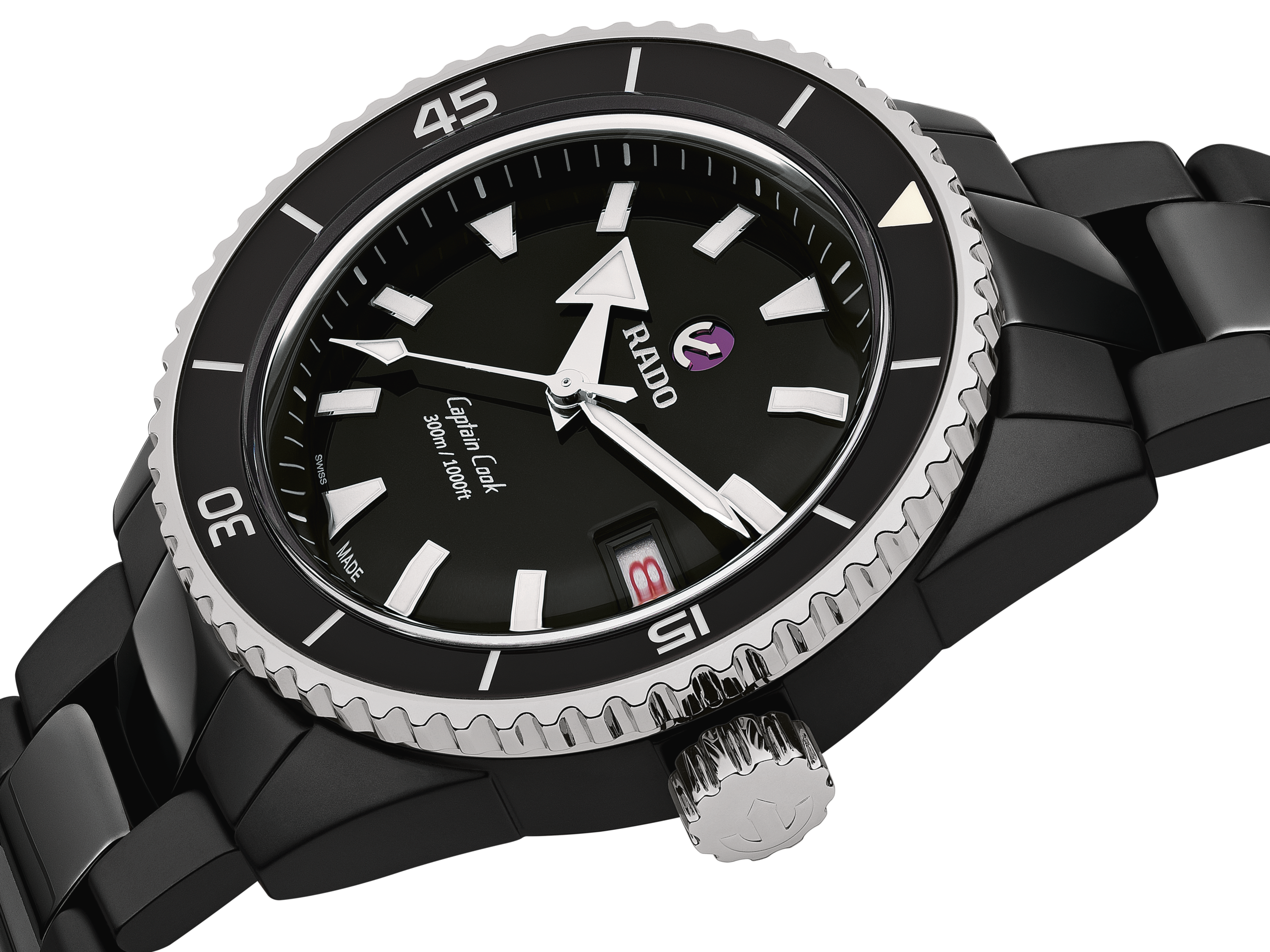 Captain Cook庫克船長高科技陶瓷潛水腕錶的防水性能經ISO 6425認證,深達300米。指針與刻度覆有Super-LumiNova®夜光塗層,與黑色漆面拋光錶盤形成鮮明對比,確保佩戴者能夠輕鬆讀取時間。整體式構造錶殼直徑43毫米,由啞光黑色高科技陶瓷製成,旋轉錶圈則採用拋光硬化精鋼材質。腕錶搭載Rado R763自動機芯,較標準精準度測試要求超出整整五分,動力儲存長達80小時。這一款式搭配拋光黑色高科技陶瓷錶鏈。無論您的探索領域為何,您的Captain Cook庫克船長高科技陶瓷潛水腕錶都將證明它是個可靠而堅韌,值得長年同行的夥伴。